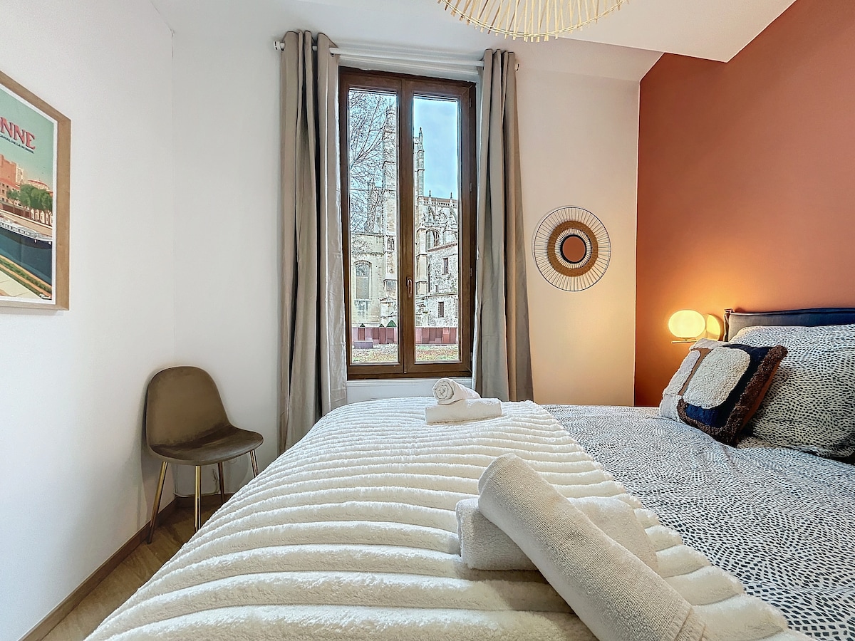 Situado en pleno centro de la ciudad de Narbona, este apartamento muy luminoso y acogedor, ofrece vistas a la Catedral de San Justo y San Pastor. Se encuentra a 8 minutos a pie de la estación de tren y de Les Halles, y a pocos metros del Museo Horreum Romain. Varias plazas de aparcamiento se encuentran a menos de 100 metros (gratis los fines de semana y entre las 18:00 y las 9:00 entre semana). La playa más cercana se encuentra a 20 minutos, y a 10 minutos del restaurante Les Grands Buffets, en coche.