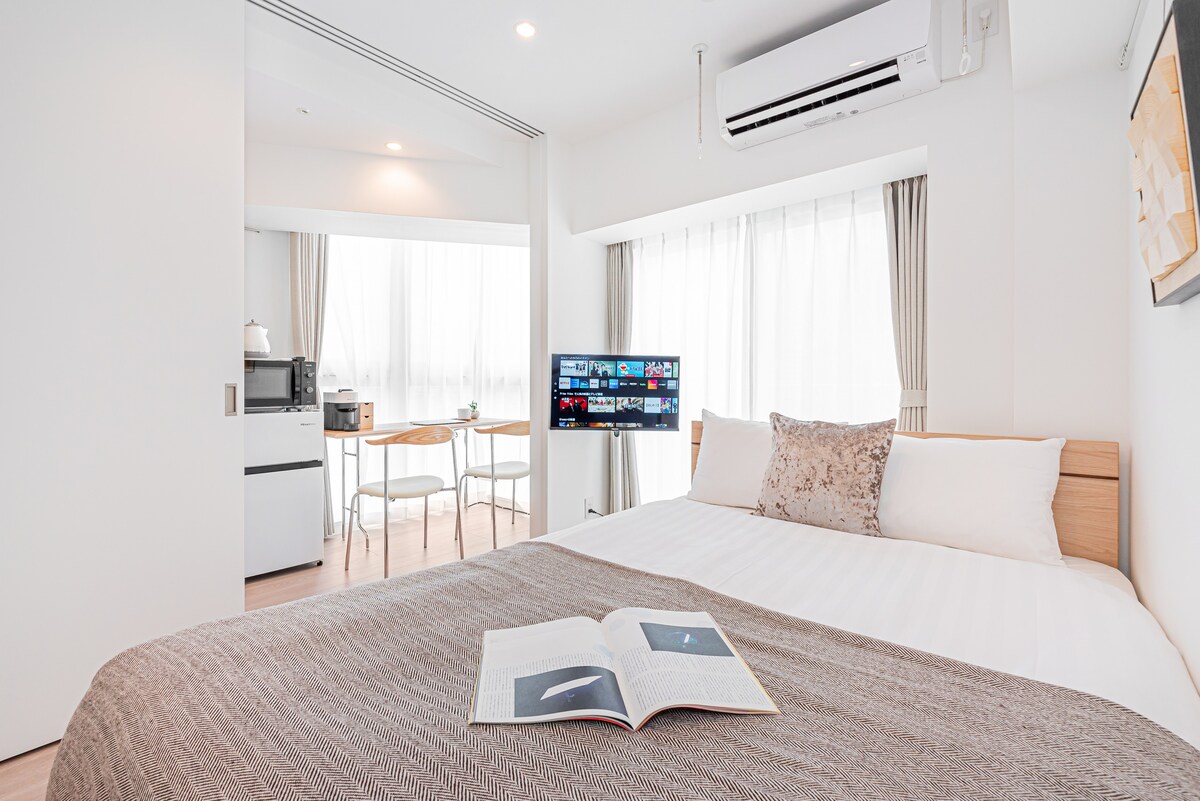 Con un diseño sofisticado, la habitación está equipada con una decoración elegante, ropa de cama cómoda (colchones Simmons) y un espacio de trabajo funcional. Con 307 pies cuadrados de espacio, la habitación incluye inodoro y baño separados. Ofrece servicios similares a los de un hotel y una amplia gama de utensilios de cocina para tu comodidad. ¡☆ Estancias largas disponibles! ☆ Estación más cercana: estación de Roppongi A solo 3–4 millas a pie de la estación ☆ Parada de autobús más cercana: frente al teatro EX Autobús directo a Shibuya, a solo 15 minutos.