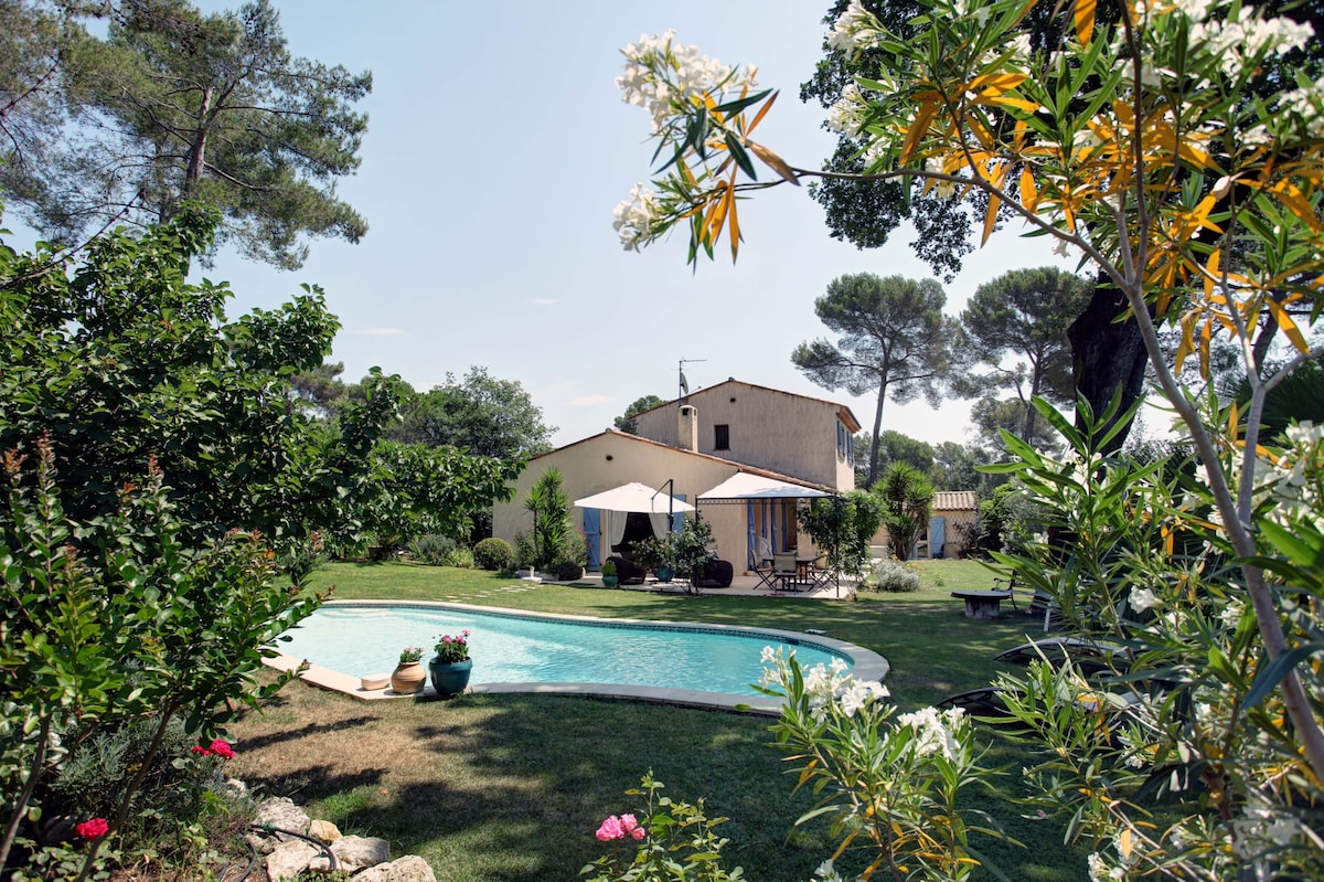 South facing authentic villa. Beautiful & calm with stylish interior. 2000m2 of developed garden with a pool house and gym. Not overlooked, totally private, 15 minutes from the coast. Fibre high speed internet connection, Electric gates, Sonos music system, Philips hue lighting interior and exterior. WIFI 6. Plancha, BBQ and pizza oven. I live close by so ready to help if you need anything.