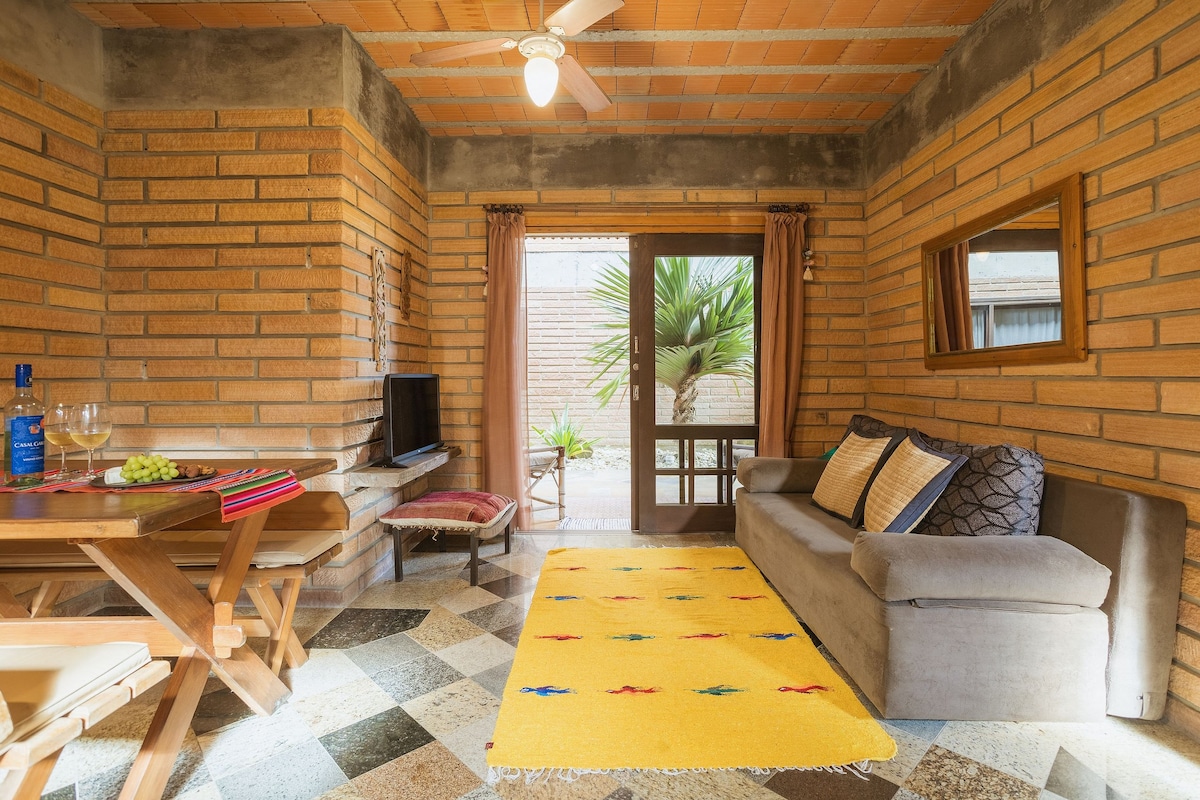 Naturaleza, paz y privacidad. Aquí, sientes todo el clima de este paraíso en un solo lugar, 3 cabañas y una suite rodeada por el amplio jardín que hacen de KaOra tu hogar en la playa de Rosa. Conseguimos comodidad con simplicidad y privacidad. La casa tiene una mini cocina con 2 quemadores de cocina (sin horno), cama doble e individual y baño. Una suite súper amplia y sin estándares. En la terraza, hamacas, mesa y sillas. Tiene una barbacoa para que disfrutes del balcón y del aspecto del jardín con especies autóctonas.