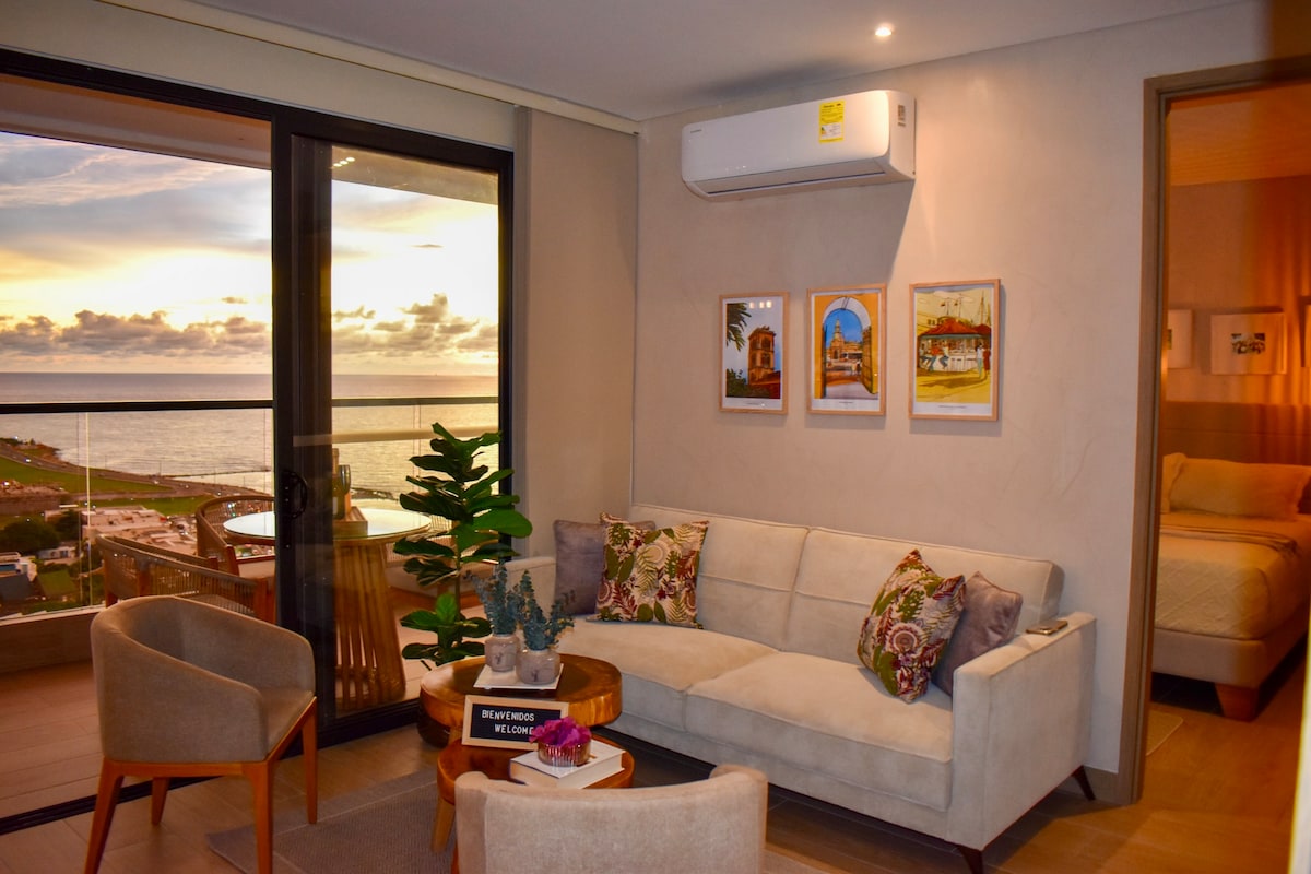 VISTA AL MAR/ apartamento a solo 5 minutos del centro histórico y 5 minutos del aeropuerto. Ubicado en primera línea de mar, todas las comodidades: vigilancia 24 horas, piscina, ascensor, parqueadero. Edificio 100% Airbnb, espacios con inspiración local y llenos de diseño, pensados para vivir historias extraordinarias. 1 habitación con cama king, 1 baño; salón comedor con sofá cama queen; cocina totalmente equipada; amplio balcón lleno de naturaleza. Wifi y aire acondicionado.