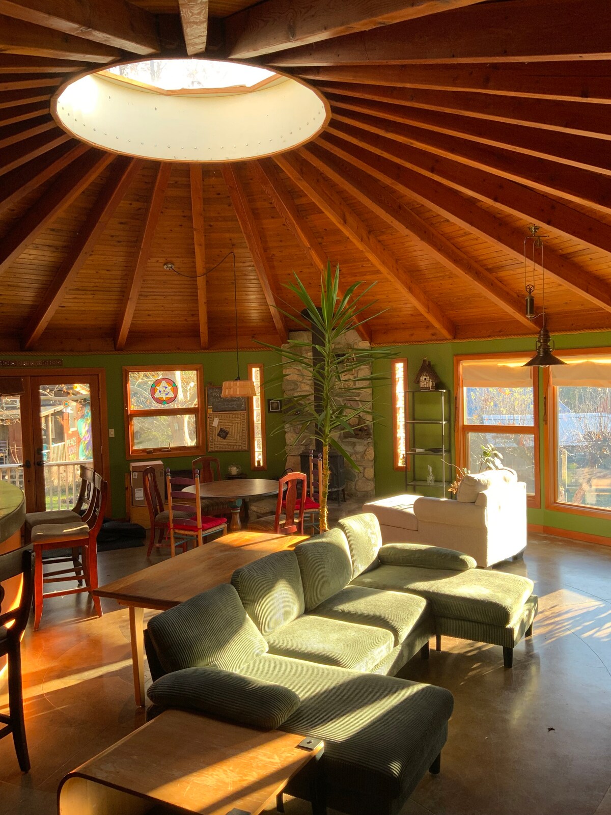 Beautiful dome house on the Salmo river. These three acres of forested property allow you to enjoy the quiet seclusion of nature, but remain only a thirteen minute drive to Nelson, and eight minutes from the Whitewater turn off (closer than Nelson). Return from a long day of skiing to warm up in the wood fired cast iron tub by the river or enjoy the six person electric hot tub with lounger and watch the Salmo river flow by. Or dry off by the woodstove and watch a movie on the 4K 100” projector