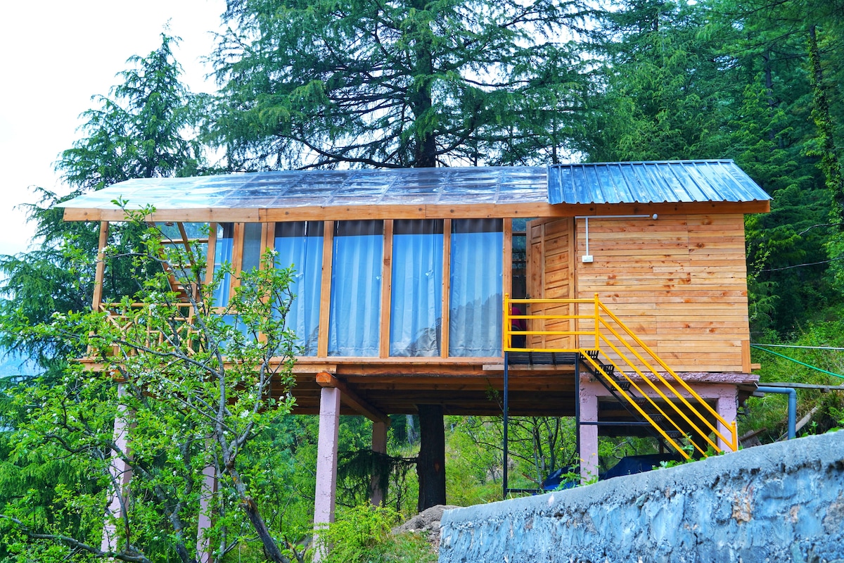 Lush Green Tree House Retreat in Deohari/Sainj Valley: Experience Nature's Magic! Indulge in a memorable stay at our beautiful tree house nestled in the serene valley of Deohari/Sainj. Wake up to breathtaking views of snow-capped glaciers right from your cozy, luxurious bed or venture out to explore captivating treks leading to mountains, waterfalls, and meadows.
