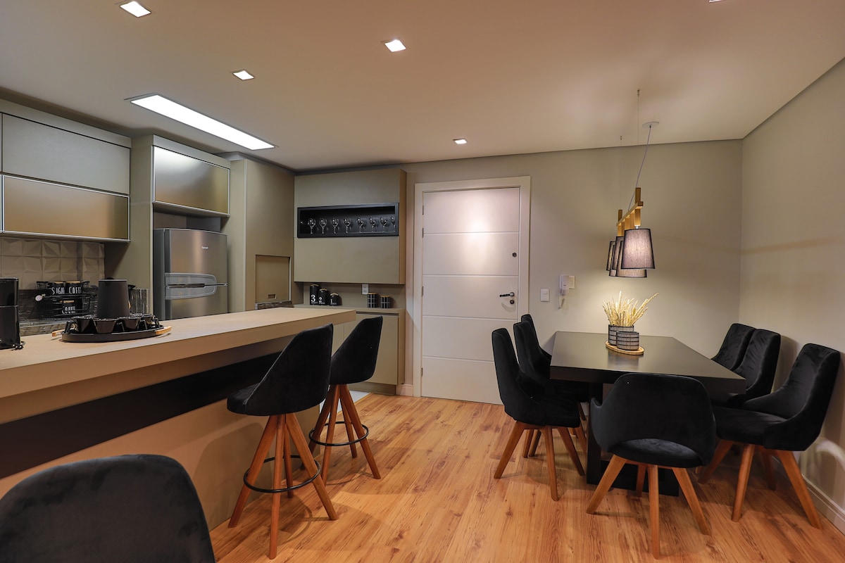 Apartamento/✨suite de alto nivel en Laje de Pedra – Canela/RS Acogedor apartamento para hasta 5 personas, con un dormitorio doble, sala de estar grande con dos áreas, chimenea, sofá cama, sofá cama y mesa de comedor. Cocina completa. Baño con dos lavamanos y un jacuzzi. 🌲 Ubicado en Mountain Village, dentro del icónico condominio Laje de Pedra, con hermosas vistas a un bosque de araucarias. Un remanso de comodidad, encanto y naturaleza en la Serra Gaúcha.