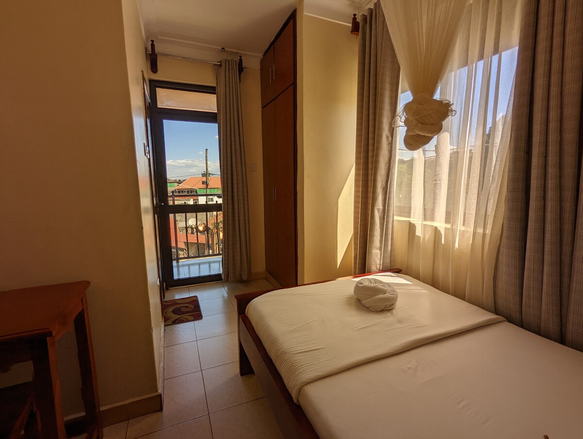 Oman Apartment is a stunning rooftop residence overlooking the breathtaking Mountains of the Moon and the vibrant skyline of Fort Portal City. With sweeping views of the River Mpanga below, this fully furnished apartment offers two spacious bedrooms, a modern kitchen, and a stylish living room that opens onto a private balcony. Guests enjoy direct access to the rooftop Kirungi Healing Garden, a serene space perfect for relaxation, sunrise views, and peaceful evenings above the city.