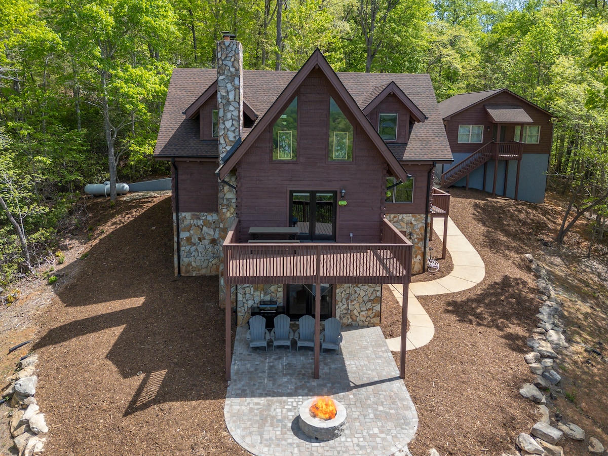 Hermosa casa de madera de 4500 pies cuadrados 5 dormitorios/3 baños y medio. Lote privado y boscoso de 9 acres con arroyos naturales. Amplia terraza, vistas a las montañas. Fogata, cornhole, rutas de senderismo y bañera de hidromasaje. 1 canoa y 2 kayaks están disponibles para usar. Debes tener un vehículo para llevar el remolque al lago. La habitación de abajo tiene TV de 86 pulgadas, mesa de billar y una nueva silla de masaje infinita. Los televisores tienen YouTube TV, Netflix.