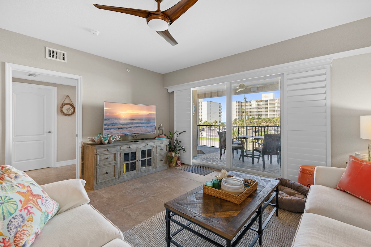 ¡Sumérgete en el mar o en la piscina en minutos! Este apartamento bellamente renovado, a pasos de la playa de New Smyrna, es perfecto para estancias de días o semanas. En un complejo turístico, ofrece todas las comodidades modernas para una estancia relajante. Incluimos toallas, sillas y otros artículos de playa. El balcón cerrado es ideal para relajarse y cenar al aire libre sin perder la privacidad. ¡Explora este oasis y regresa con las pilas completamente recargadas!