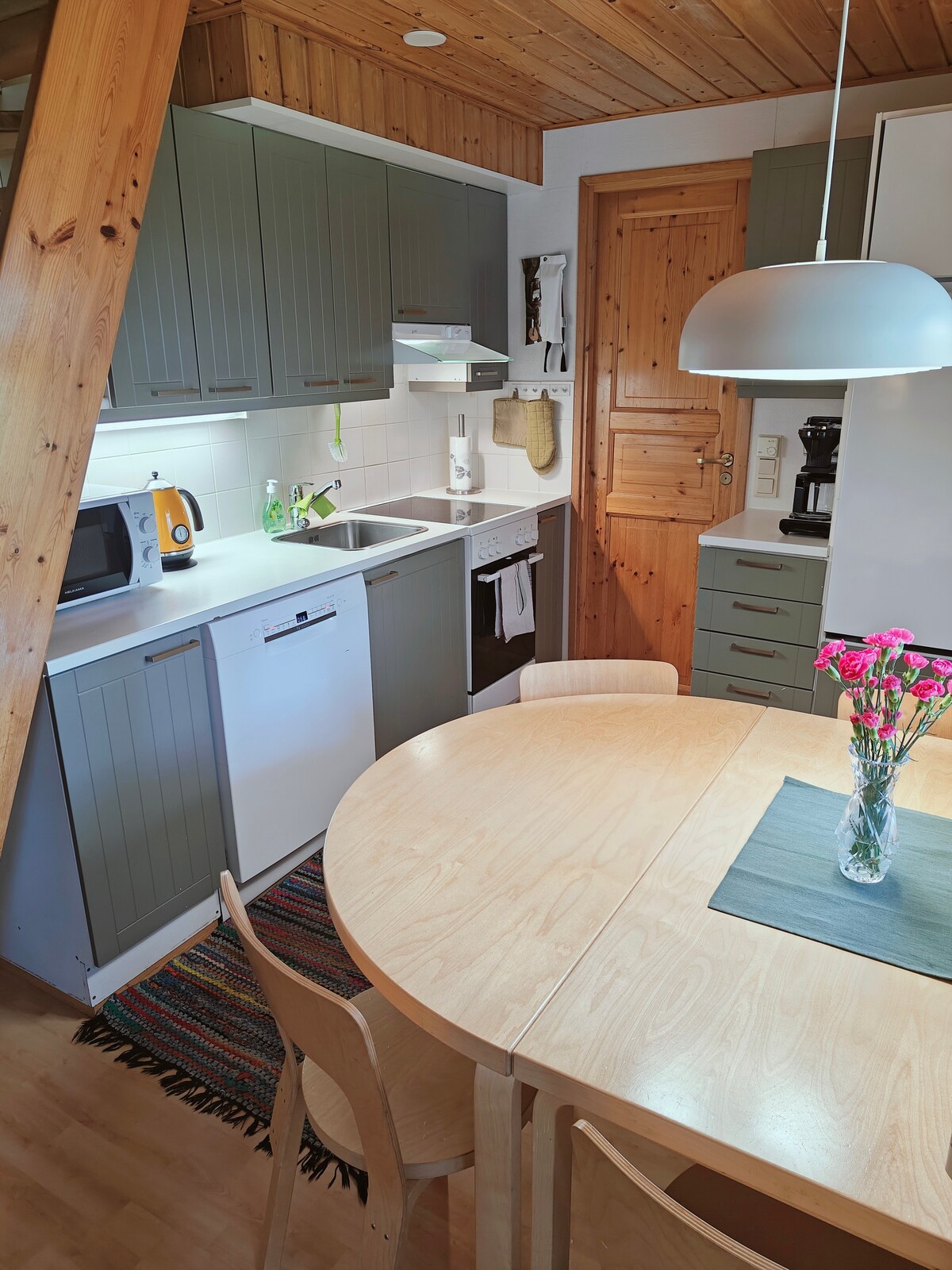 Bienvenido a mi casa de vacaciones en el corazón de Saariselkä, a solo unos minutos a pie de los senderos del Parque Nacional de Urho Kekkonen. Renové y amueblé mi casa por completo en 2023 con todas las comodidades modernas, al tiempo que conservé la chimenea tradicional de piedra y la sauna finlandesa. Con tres camas arriba y un gran sofá cama abajo, el alojamiento es cómodo para varios tipos de grupos. El espacio de trabajo a distancia, la cocina totalmente equipada y la lavandería también lo hacen ideal para una estancia más larga.