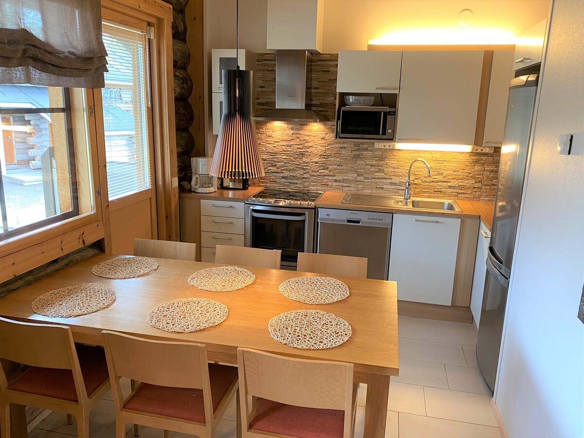 Disfruta del encanto de Laponia en esta casa de troncos totalmente renovada y acogedora, perfecta para familias o grupos. Lujosa y con una ubicación ideal, ofrece impresionantes vistas al Ártico y está a poca distancia a pie de las tiendas, restaurantes, actividades y los mejores lugares para ver auroras boreales de Saariselkä. También se puede llegar fácilmente en avión o tren. ¡Estaremos encantados de ayudarte con todos los aspectos de tu estancia! Incluye sauna, dos chimeneas, wifi, Netflix y plaza de aparcamiento.