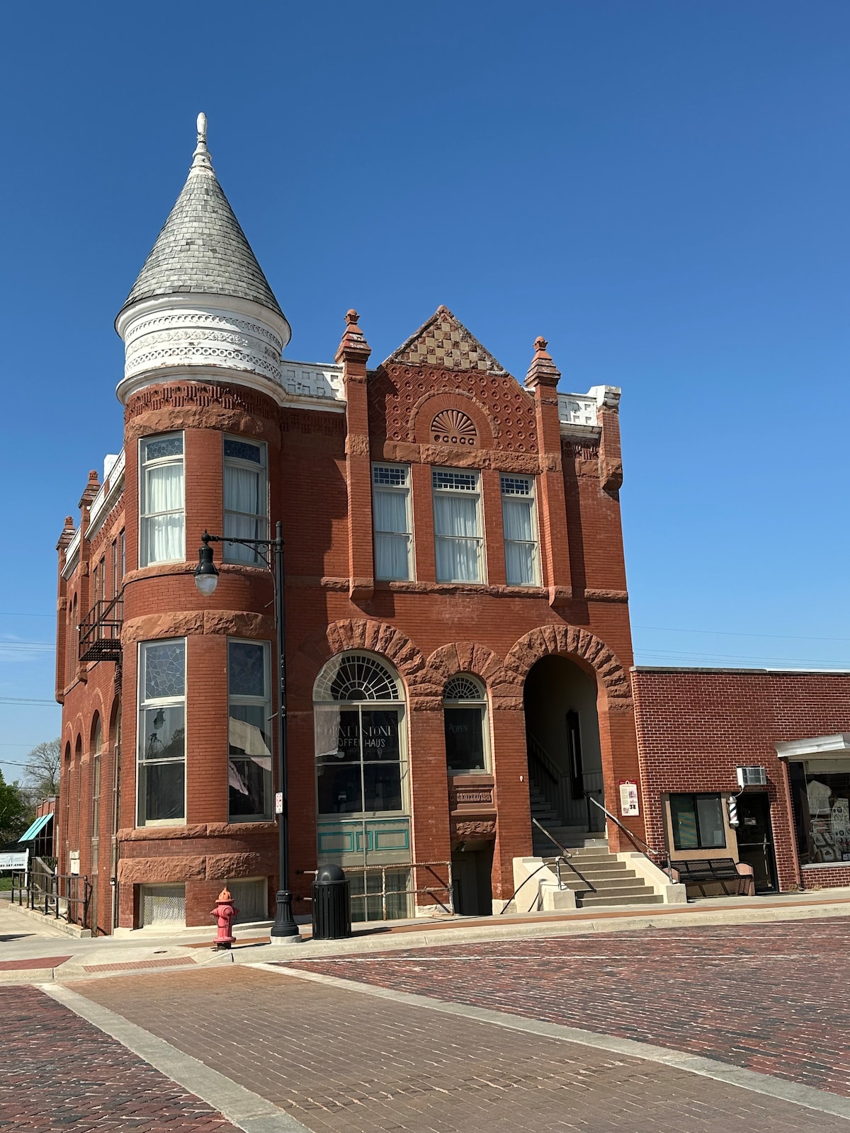 Escape to the Cozy Cabin, a charming loft-style room inspired by the warmth and simplicity of a cabin retreat. This inviting space features real wood log siding walls, exposed rustic beam ceilings, and a beautiful stone fireplace — all wrapped in modern comfort. Located at the heart of downtown Sabetha within the Limestone Lodge, you'll enjoy a prime location on Main Street near dining, shopping, and local attractions. *Please Note: Bed located on loft accessed by stairs.
