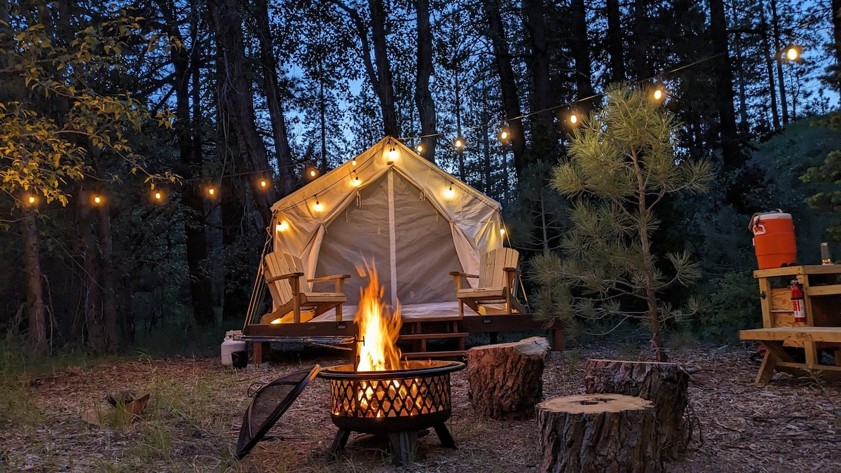 El Canopy es una experiencia de glamping. Ubicado a las afueras de la ciudad, pero cerca del centro de la ciudad, tiendas y aventuras. Experiencia de campamento única con un toque moderno y cómodo. Proporciona una espaciosa tienda de campaña de lona, en una terraza, debajo del dosel de la naturaleza. Cocina completa, 2 camas completas, toma de corriente, inodoro, salón al aire libre, área de enjuague estilo camping, mucho estacionamiento y una sensación de hogar. El Canopy cuenta con agua potable del monte Shasta y café local artesanal con cada estadía. ♡