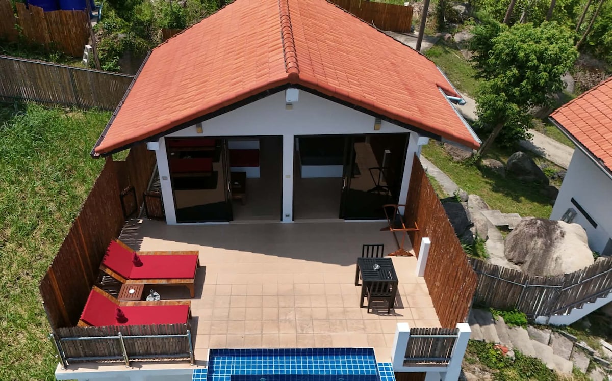 Nuestra villa tropical es un sueño hecho realidad. Se encuentra perfectamente en una ladera empinada a unos 35 metros sobre el nivel del mar con una impresionante vista panorámica al mar en la pequeña isla aislada de Koh Tao. Al instante querrás relajarte en la generosa terraza de madera y disfrutar de la puesta de sol. O date un chapuzón en la piscina infinita. O no hacer nada en particular, sino disfrutar de la vida. De cualquier manera, este es simplemente un lugar hermoso.