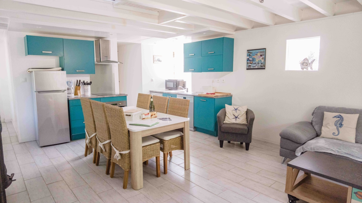El alojamiento se encuentra en el segundo y último piso de un pequeño complejo de cuatro apartamentos SIN ASCENSOR. Se compone de una sala de estar que se abre a un balcón con vistas a la bahía, y un gran dormitorio con una cama de 140 x 190 cm. Wifi y TV conectada. Capacidad máxima para 2 personas. En el corazón del pueblo, se puede hacer todo a pie. Estacionamiento en pequeño patio privado. Llegada autónoma con caja de llaves. Libro con mis direcciones y lugares favoritos.
