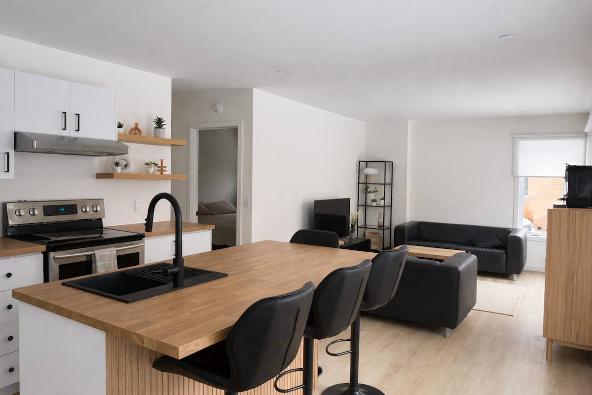 Descubra nuestro espacioso 4 1/2, perfecto para su estadía en la ciudad. Disfruta de 2 elegantes habitaciones. Relájese en una amplia terraza con vistas a la puesta de sol. Disfrute de estacionamiento privado y fácil acceso para toda la familia. Situado a solo 5 minutos andando de la calle principal, estarás cerca de los mejores restaurantes y bares. Entrada independiente para mayor comodidad e intimidad. ¡Reserva ahora!