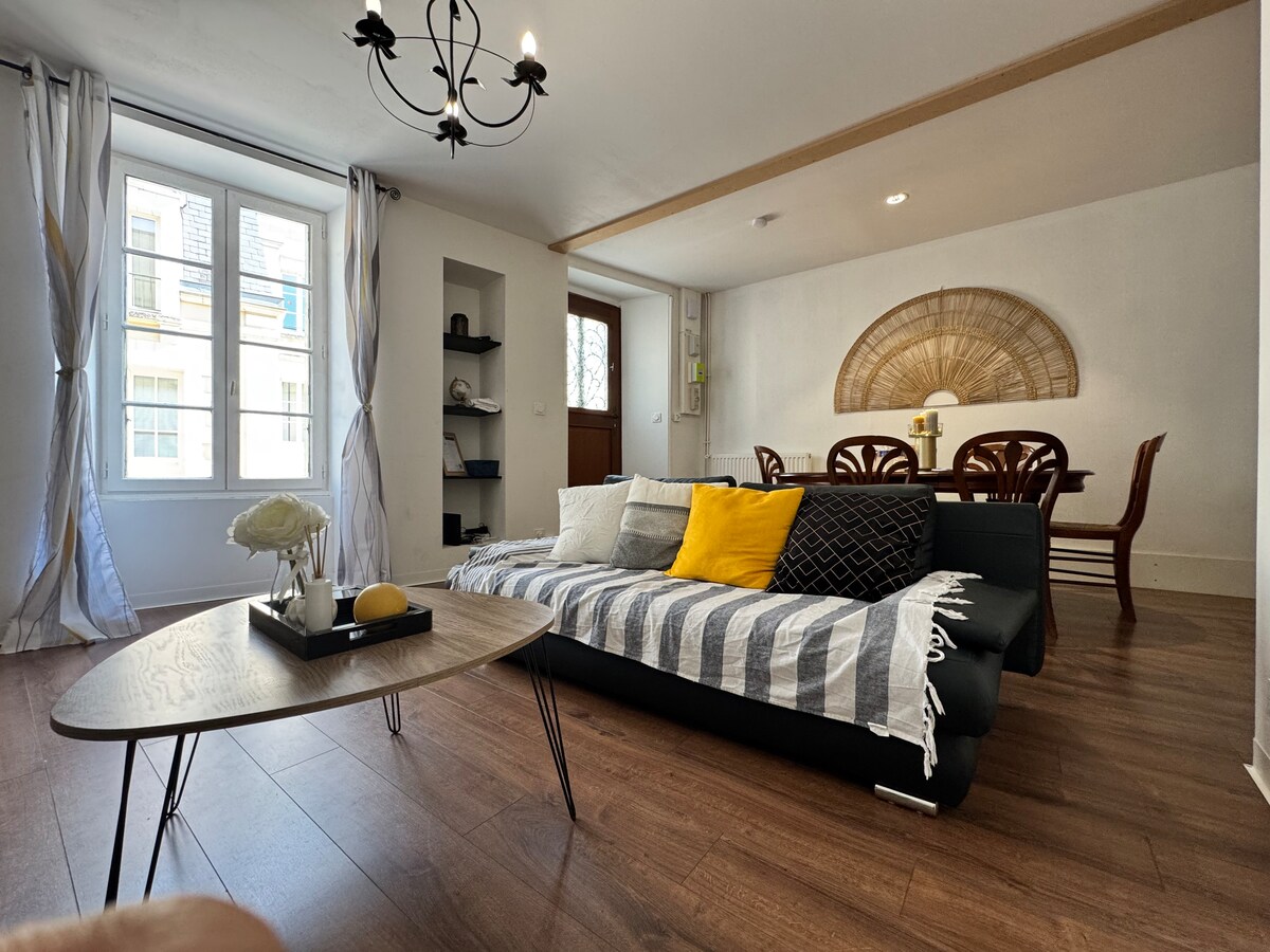 Logement paisible à 5 minutes de marche du centre ville, à 200m de la gare et de toutes les commodités. Venez découvrir cette charmante maison de 40m2 totalement rénovée. Elle vous permettra d’être au centre de la ville et de découvrir facilement ses environs. À moins d’une heure de route, vous avez le choix de votre destination : Puy du Fou - Futuroscope - CenterPark - Terra Aventura - Marais Poitevin - Châteaux de la Loire