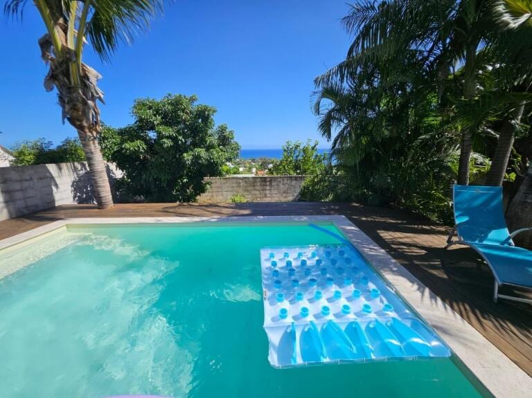 En Manapany les bains 🌊 ¡5 minutos a pie de la piscina de natación de Manapany! Todo el alojamiento, completamente independiente con su portal, espacio de estacionamiento , hermoso jardín. Con vistas al mar 🌊 y a la montaña ⛰️ Piscina climatizada con zona de jacuzzi, terraza abierta y cubierta 🫧 Una cama doble grande y un sofá convertible muy confortable y una cuna si es necesario. Estacionamiento, wifi, zona de relajación