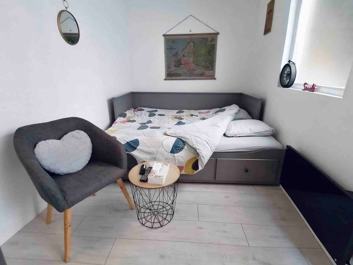 Nuestro estudio 'Le Nid', de 21 m2, situado en la planta baja de nuestra casa, con vistas a un pequeño jardín al abrigo de las miradas, cerca del centro de la ciudad, la estación de tren TGV y el canal de Nantes en Brest. Equipado con una pequeña cocina (microondas, nevera pequeña, hervidor de agua), cuarto de baño, con inodoro y ducha. Ideal para dos personas, con un sofá cama de 140 x 190 (ropa de cama incluida). Opcional: garaje de bicicletas seguro