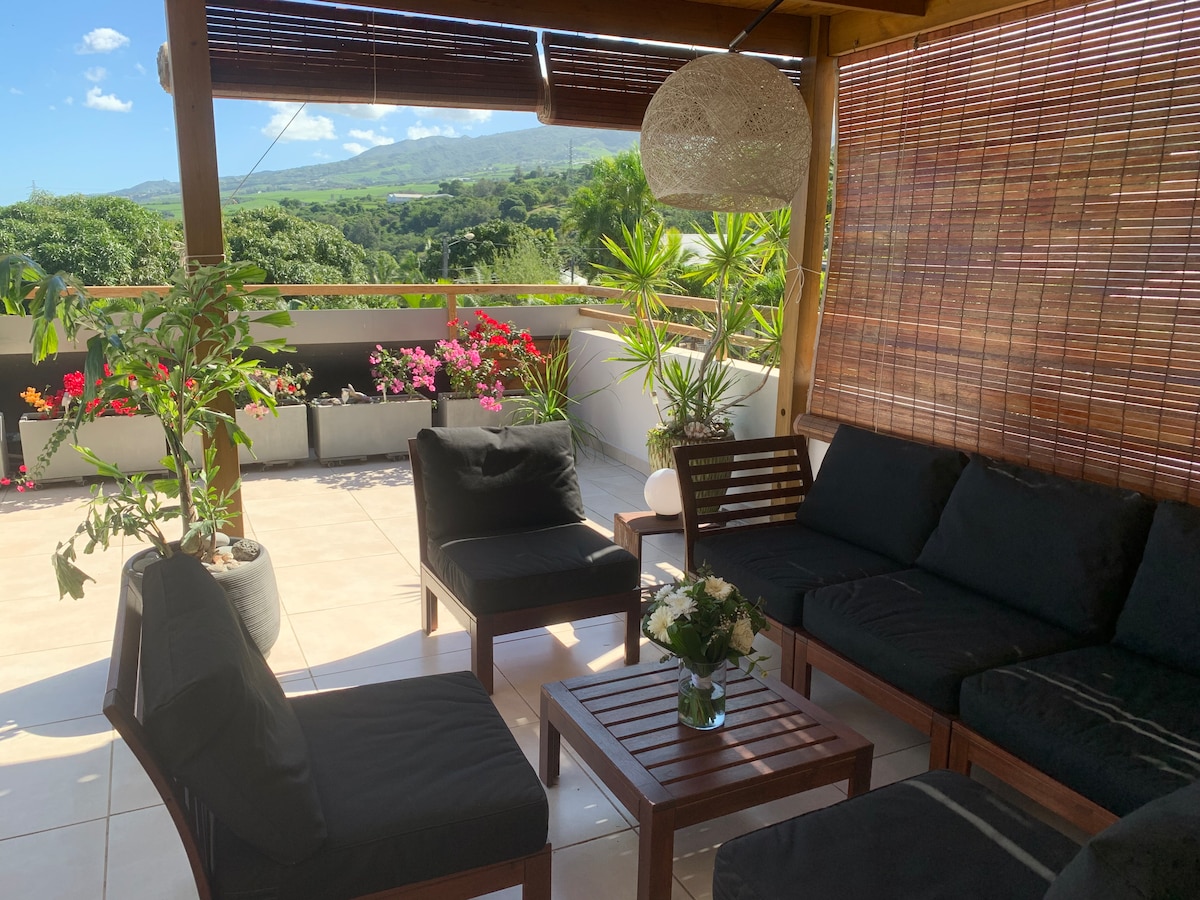 Studio entièrement équipé, au rez-de-chaussée de notre maison, dans un environnement très calme, à l'écart du centre ville. Un lit double, un lit mezzanine et un canapé lit 1 place. Cuisine entièrement équipée. Espace détente extérieur. A 10 minutes du centre de la Rivière, 20 minutes de la plage de Saint-Pierre, 15 minutes de l'Etang-Salé. Possibilité de mise à disposition d'une voiture pendant votre séjour (sur demande).