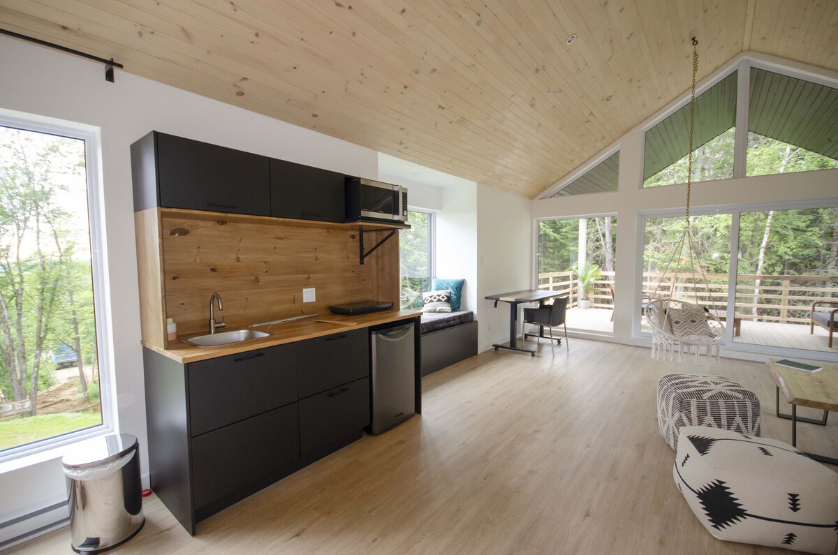 Pequeño chalet escandinavo para dos personas idealmente ubicado para disfrutar de las atracciones de Charlevoix. Cuenta con un circuito termal (bañera de hidromasaje, sauna, hammam). Muy íntimo y en medio del bosque, la vista da al majestuoso río y a las montañas a lo lejos. Todo el equipamiento moderno está allí y la comodidad es absoluta: aire acondicionado y chimenea al aire libre. El diseño de concepto abierto fue diseñado para una experiencia inmersiva en la naturaleza: grandes ventanales, ducha panorámica. Acceso a través de una carretera privada a 500 m.