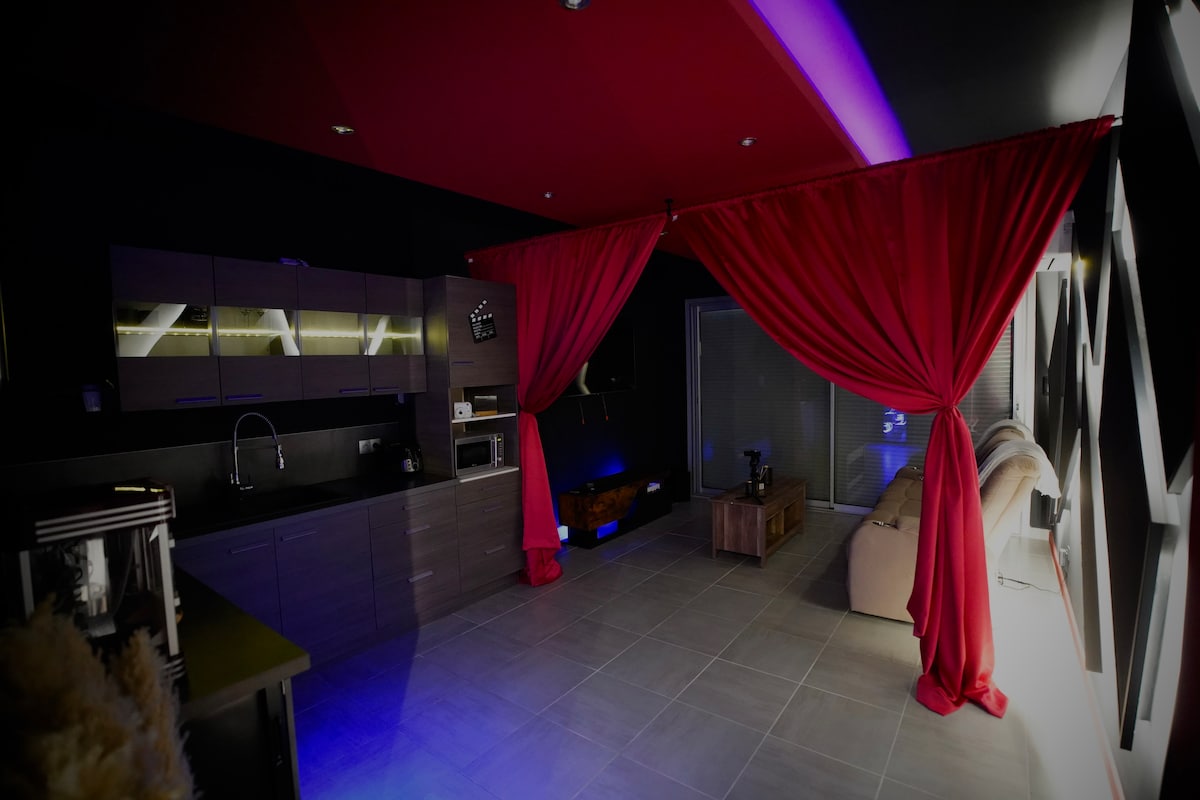 Descubre la experiencia única que ofrece nuestro apartamento con una inmersión total en un auténtico cine privado 🎞️ Con una gran pantalla de proyección de 280 cm y un cómodo sofá, disfrute de sus palomitas de maíz frente a la película de su elección. Disfrute de una habitación espaciosa y una cama con memoria, así como de una hermosa terraza orientada al sur. El baño y su cabezal de ducha multijet es un verdadero valor añadido.