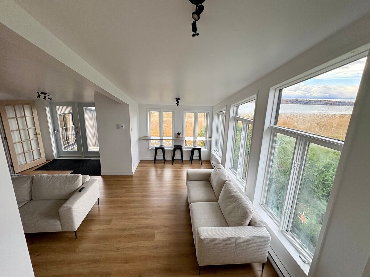 Abrimos las puertas de nuestra hermosa casa en la Île d'Orléans. Situado en una propiedad de 1 acre con árboles maduros y una vista impresionante del río St. Lawrence, ven y recarga energías en el campo, a solo 20 minutos del Viejo Quebec. Los servicios en el lugar incluyen un spa, chimeneas de leña interiores y exteriores, barbacoa, alojamiento para 10 personas y 3 baños. Los viñedos, los productos locales y el encanto del viejo mundo están a solo unos minutos en auto de la casa. CITQ: 311604