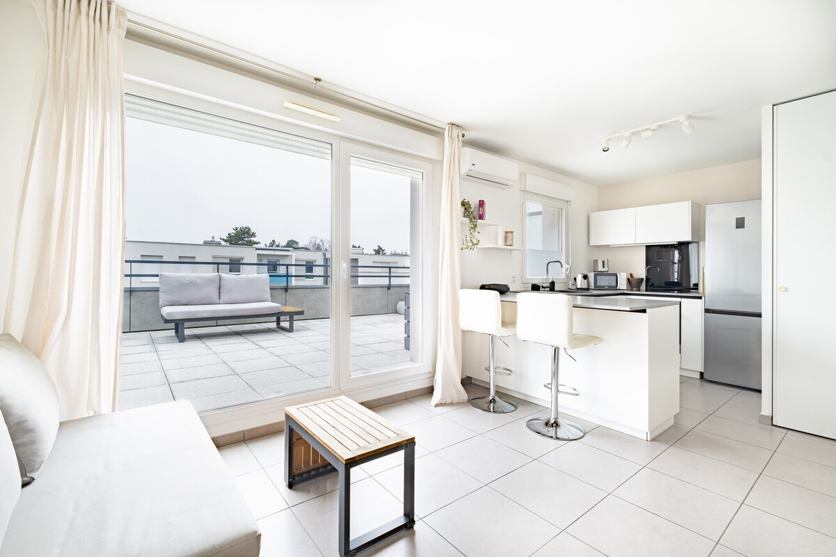 Alójese en este luminoso T2 propicio para la relajación, completamente renovado y con todas las comodidades: ✔ Estacionamiento subterráneo privado bajo petición ✔ Gran balcón en el segundo piso tranquilo con vistas despejadas al castillo Aire ✔ acondicionado, wifi de fibra, Netflix, lavadora, lavavajillas, horno, todas las comodidades y restaurantes a 3 minutos a pie ✔ Ubicación ideal: cerca de Eurexpo, parque OL Groupama stadium, LDLC Arena, hospitales, universidades, acceso directo (tranvía/autobús) al centro/estaciones de Lyon ✔ Ideal para parejas, hasta 4 personas