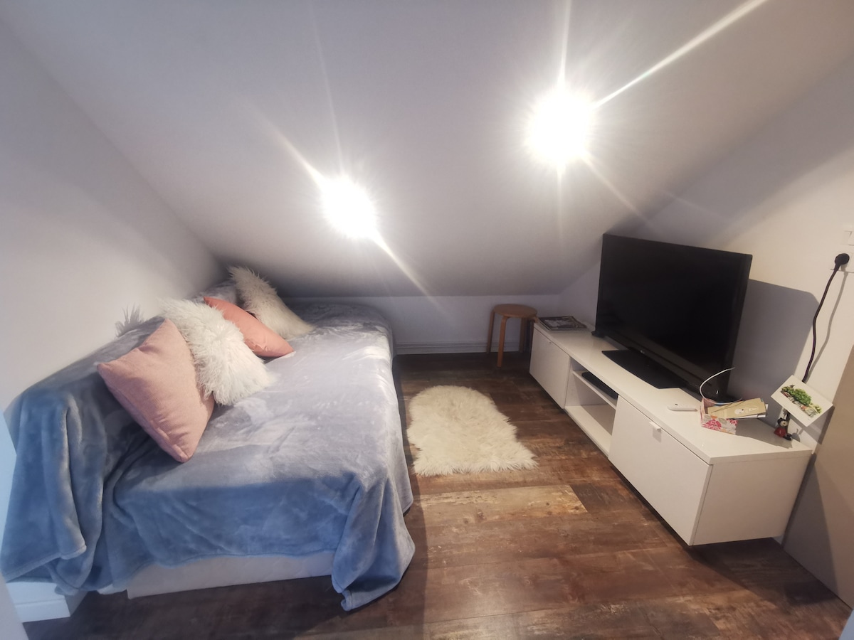 Nuestra casa es de los años 1950 y fue diseñada de la A a la Z por mi papá. Vivimos en el primer piso y el apartamento está debajo. Lo hemos puesto todo al día. El apartamento incluye 1 habitación grande..con cama 1 sala de estar con sofá y 1 cama individual 1 cocina totalmente equipada 1 ducha 1 inodoro Tiene acceso a través de la sala de calderas al jardín. Puede disfrutar de sus comidas y descansar. Todo está tranquilo.