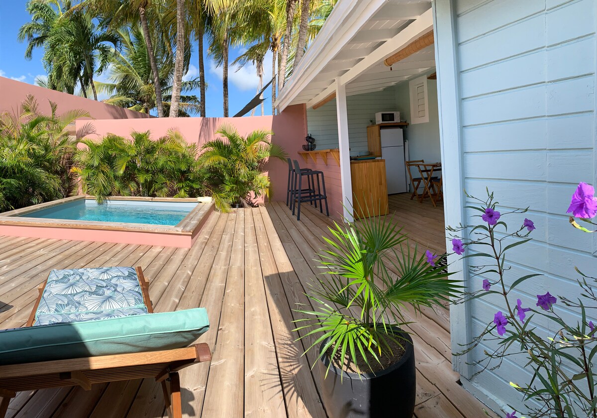 Le damos la bienvenida en un entorno agradable y con mucho encanto. El complejo consta de 3 bungalows ubicados en el corazón de un jardín tropical alrededor de una hermosa laguna artificial... Idealmente situado a 5 minutos del spot de surf de Helleux, a 5 minutos del punto de kite de Bois Jolan, a 10 minutos de las playas más bellas de Sainte Anne o Saint François.