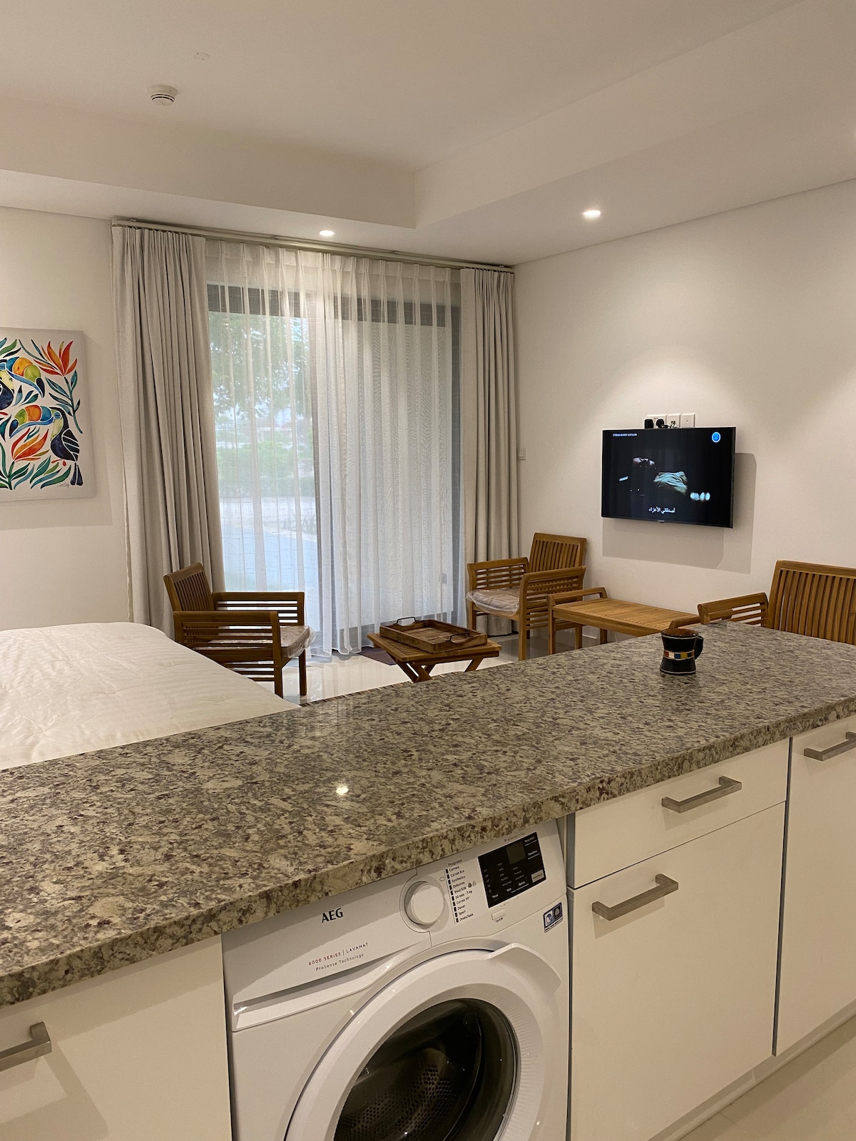 Mi nuevo y acogedor apartamento tipo estudio en Hawana Salalah te invita a relajarte y descansar. Disfruta de la proximidad inmediata a la hermosa playa de arena blanca, a solo 5 minutos a pie cerca del hotel Rotana de 5 estrellas, donde puedes ver impresionantes puestas de sol e incluso delfines desde el embarcadero. O simplemente dirígete a la piscina, que se encuentra justo al lado del departamento. La Marina, el corazón de Hawana, está a unos 10–15 minutos a pie. Allí encontrarás restaurantes, un bar, un club y encantadoras cafeterías.