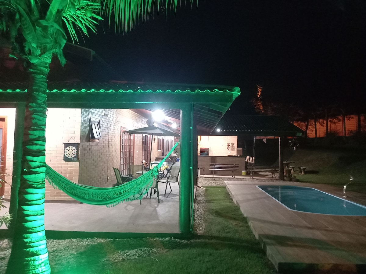 Alojamiento cómodo y seguro, diseñado para el descanso y la alegría. Piscina CLIMATIZADA hasta 32 °C (89,6 °F), con jacuzzi. Capacidad para hasta 30 personas: 4 suites, sala de estar y zona gourmet totalmente equipada, todo con aire acondicionado. Las parrillas para asar, un horno para pizzas y una estufa a leña completan la experiencia. A solo 3 minutos del parque acuático Thermas, con wifi de 400 Mbps, vigilancia de seguridad y un perímetro totalmente vallado. Bar en la piscina, parque infantil, chimenea, mesa de billar, futbolín, hamacas y bungalow. Se admiten mascotas. Naturaleza exuberante en toda la propiedad.