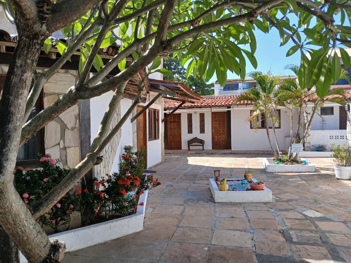 Una casita en el sitio en Monte Gordo. Ideal para una pareja, un ambiente familiar. Estamos a 9 minutos en auto de la playa de Guarajuba y a 20 minutos de Praia do Forte. QUARTO-SALA COM: - Una cama doble, aire acondicionado, armarios, escritorio, wifi, TV inteligente en la sala de estar. - Cocina equipada, balcón con hamacas con vistas al amplio césped verde. El desayuno NO está incluido. El lugar es corto y una ducha después de la playa. No 🚫 aceptamos mascotas.