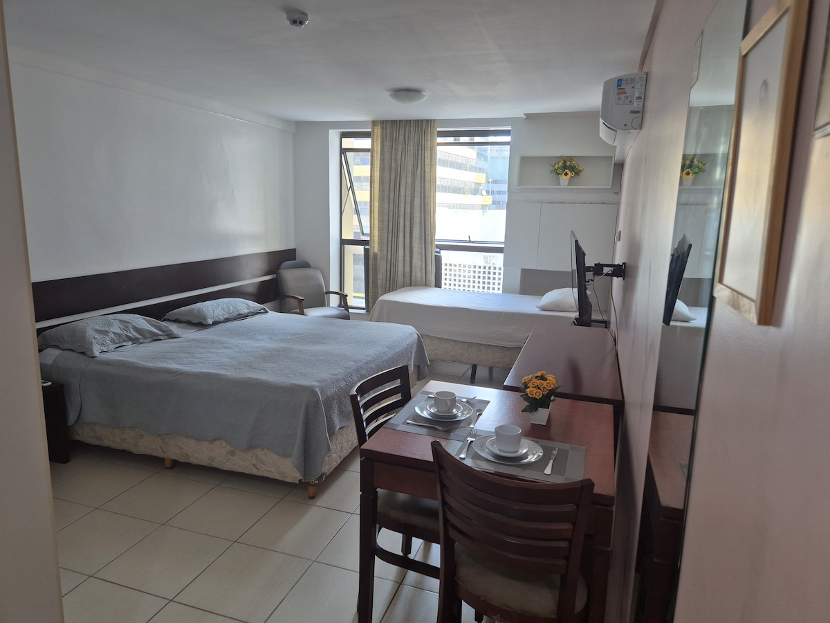 ¡Este elegante estudio en Salvador es su refugio de alto estándar: disfrute de un ambiente totalmente climatizado y del confort superior de la cama king! Ideal para relajarse o trabajar, posee espacio para notebook y un agradable balcón. El condominio es un club: piscina interior y exterior, restaurante y gimnasio. ¡Ubicación inigualable a 500 metros del Salvador Shopping! Reserve y garantice su confort premium en la capital bahiana.