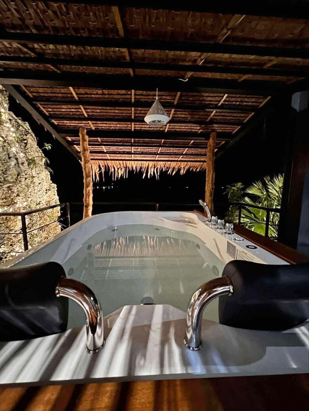 📍Los acantilados de la isla de Samal (a 15-20 minutos en coche del muelle de Samal) Ven a disfrutar de nuestra Cabaña Celestial III (con capacidad para hasta 4 personas, pero el precio base es solo para 2, así que asegúrate de indicar el número correcto de personas). ✅ Cabina de cristal con aire acondicionado ✅ Bañera privada con vistas ✅ Acceso a nuestra terraza común en la cima de los acantilados ✅ Televisión lista para Netflix ✅ Wi-Fi Inodoro y ducha✅ privados ¡¡ADVERTENCIA DE ESCALERAS!!️ 20 pasos hacia abajo, los precios de Airbnb no incluyen el acceso a la piscina de la selva (250 ₱/pax)
