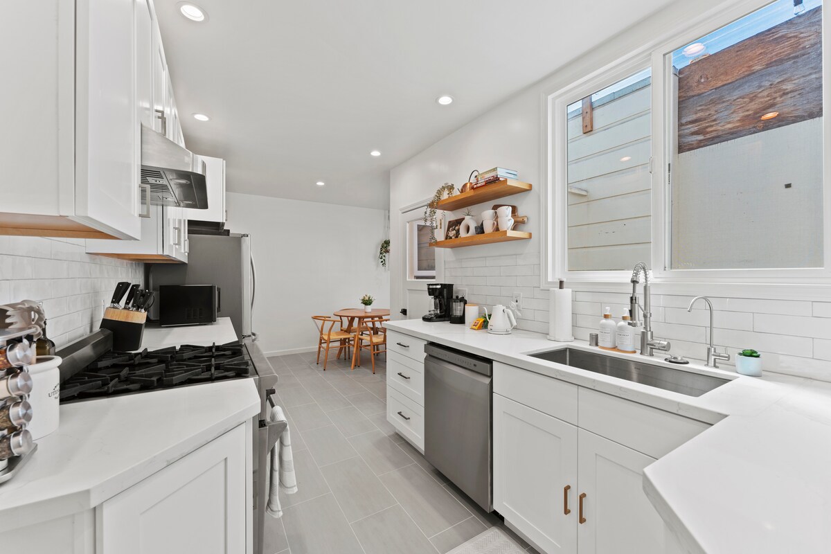 Relájate en nuestro estudio elegante recién renovado, tu propio refugio privado sin espacios compartidos. Disfruta de una lujosa cama tamaño king, una cocina totalmente equipada y un fácil estacionamiento gratuito en la calle. Ubicado en el acogedor Sunset District, a solo una milla de Ocean Beach y Golden Gate Park, es ideal para parejas, familias pequeñas, asistentes a festivales y cualquier persona que visite a amigos o familiares en San Francisco o en el Valle.