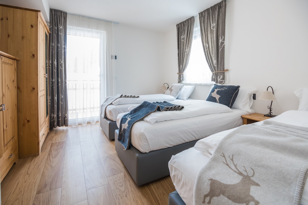 El apartamento "Antelao" de aproximadamente 100 metros cuadrados se encuentra en el primer piso de Villa Glauber y consta de tres dormitorios, una cocina con balcón y dos baños. El porche, por otro lado, gracias a sus comodidades, ofrece una maravillosa vista del jardín y el Nine Cime y, sobre todo, un ambiente relajante en todas las estaciones del año. Las estufas principales y las vistas al bosque lo hacen único.
