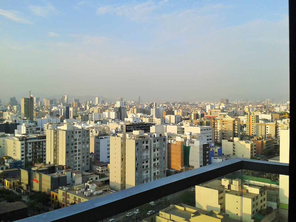 Departamento de estreno ubicado en excelente zona en Lima, Peru. Tendrás cerca restaurantes, centro comerciales, farmacias, supermercados, casinos, gimnasios, y oficinas corporativas y comerciales a menos de tres cuadras de distancia o cinco minutos a pie. Disfrutarás de un departamento totalmente nuevo y recién amoblado que hará tu visita en Lima placentera. El apartamento está diseñado con la finalidad de brindar al huésped un ambiente cálido y relajado, y disfrutar de una gran vista.
