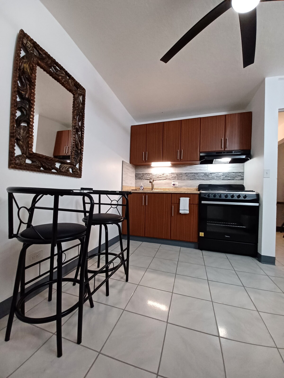 Disfruta de la sencillez de este alojamiento tranquilo y céntrico. Apartamento de una habitación con estacionamiento, equipado con cama full, sofá cama, a/c, tv, wifi, calentador de ducha, abanico, sala/comedor, cocina equipada con todos los enseres nuevos y cafetera (se incluye harina de café). A pasos de centro comercial, farmacia, laboratorios, restaurantes, supermercado y hospital. Ahora equipado con placas solares y batería Tesla para garantizar electricidad continua durante tu estancia.