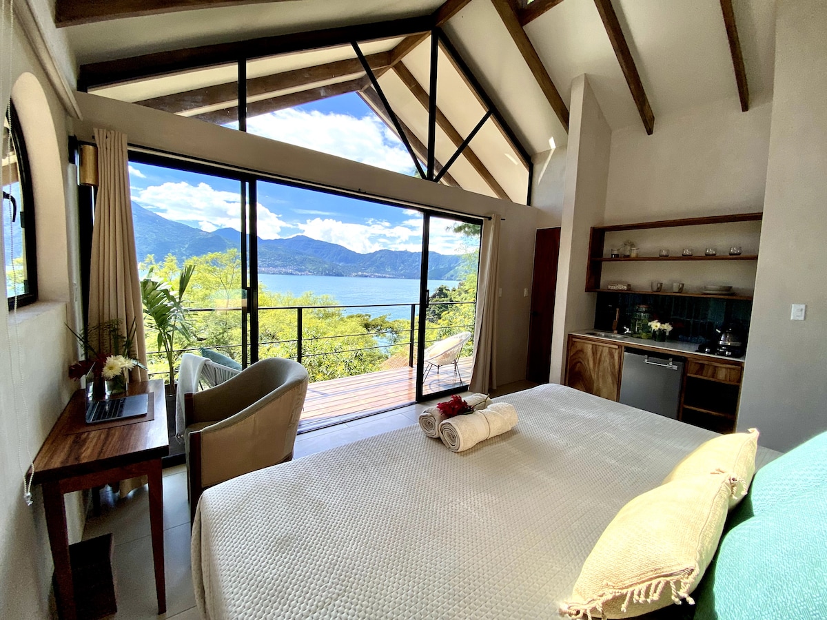Enjoy breathtaking panoramic views of Lake Atitlán, its surrounding volcanoes, and mountains from your artisanally designed sanctuary. Wake up to epic sunrises and birdwatching while lounging on the sofa or a queen orthopedic mattress. The house features a chef-designed kitchen, handcrafted decor, WiFi, 1.5 baths, a hot shower, and easy access to hiking and yoga. A 7-minute walk or short tuk-tuk ride from central San Marcos. Ideal for couples, creatives, digital nomads, and nature lovers.