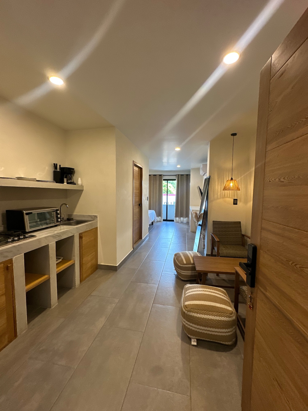 Ubicado en la Punta de Zicatela, a unos minutos caminando de la playa, restaurantes y demás atracciones de la zona. Con excelente internet de fibra óptica y Starlink. Tiene una terraza privada en el segundo nivel, con una hermosa vista, mesa y sillas. Cama queen size, AC, ventilador, cocineta con frigo, cafetera, tetera, filtro de agua. Baño completo y un pequeño clóset. Tiene un balcón con una pequeña mesa y dos sillas, con persianas de madera que al abrirse tienen vista hacia el jardín.