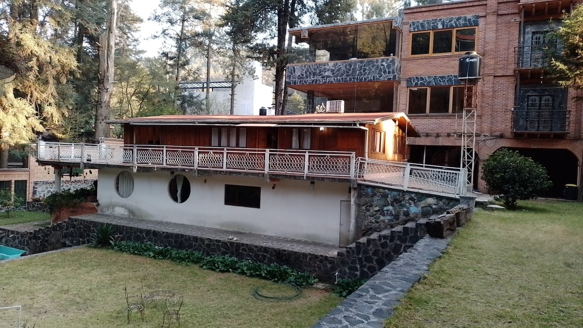 Bella casa de huéspedes, estilo Hacienda, hermosa terraza con asador, rodeada de vegetación, mucha luz y privacidad. Galería disponible, principalmente obra de artistas mexicanos. Seguridad 24/7 en exclusivo fraccionamiento. Hay excelentes restaurantes, centros comerciales, cines en la cercanía y St. Fe CDMX a 15 minutos. Se puede visitar el espectacular Nevado de Toluca a unos 45 minutos aproximadamente. El Aeropuerto Internacional de Toluca se encuentra a quince minutos en auto o taxi.
