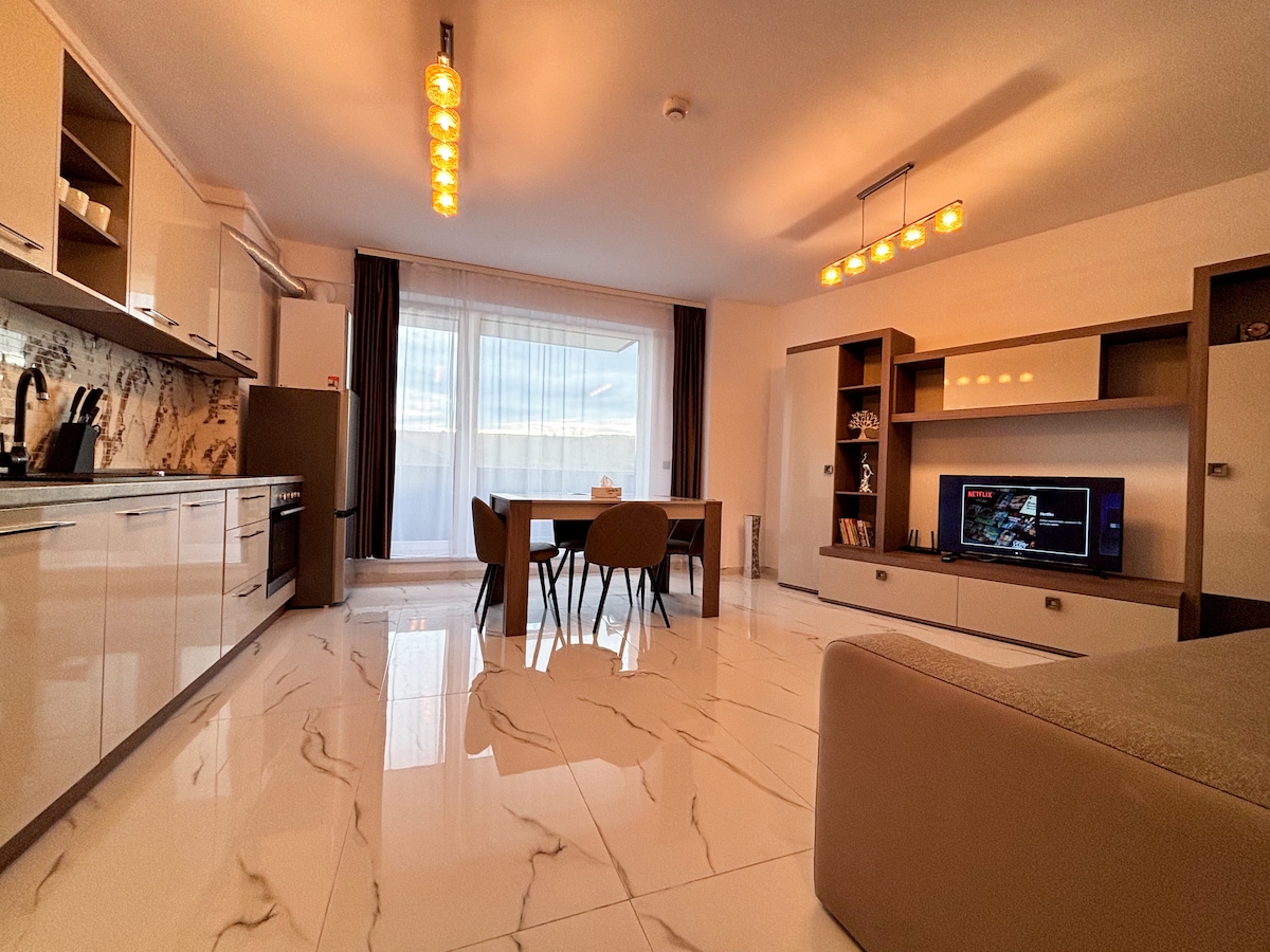 Apartament modern, elegant și primitor, ideal pentru sejururi scurte sau business. Dispune de două aere condiționate, balcon, parcare privată și un spațiu dedicat pentru lucru. Mobilat cu designer, oferă confort premium: pat king-size, bucătărie complet utilată, veselă, dotări moderne și un ambient rafinat, locul perfect pentru relaxare și productivitate.