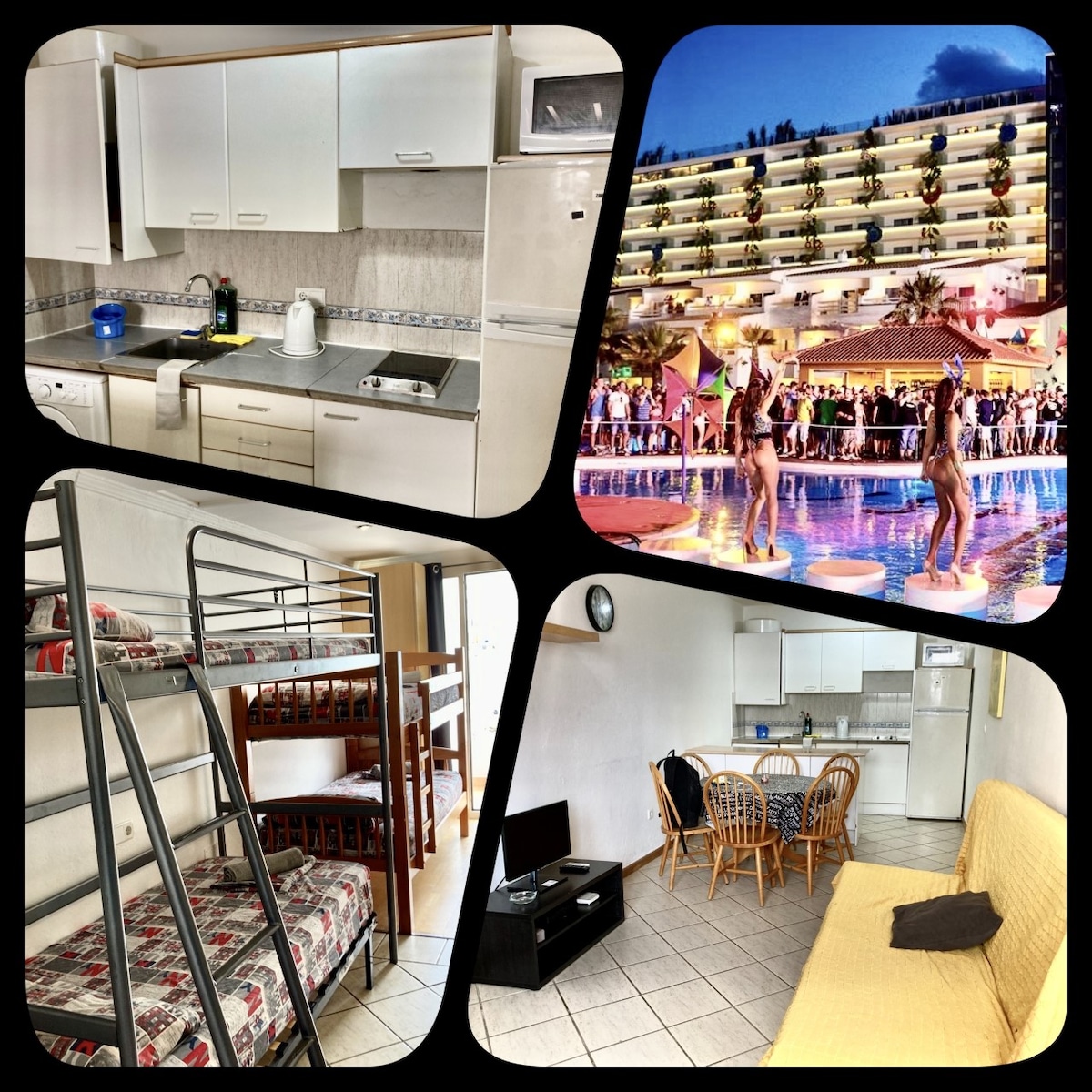 We rent an apartment in IBIZA for 6/8 people, 2 bedrooms with 2 bunk beds and 1 single bed, 1 double sofa bed in the living room, kitchen complete with all appliances (microwave, toaster, coffee maker, kettle, washing machine, refrigerator , etc ...), 2 bathrooms, balcony with sea view, air conditioning, LED TV, internet WI-FI 50MB fiber, the capacity is 8 guests maximum. Located in Playa d'en Bossa area facing the sea, a few meters from Ushuaia.