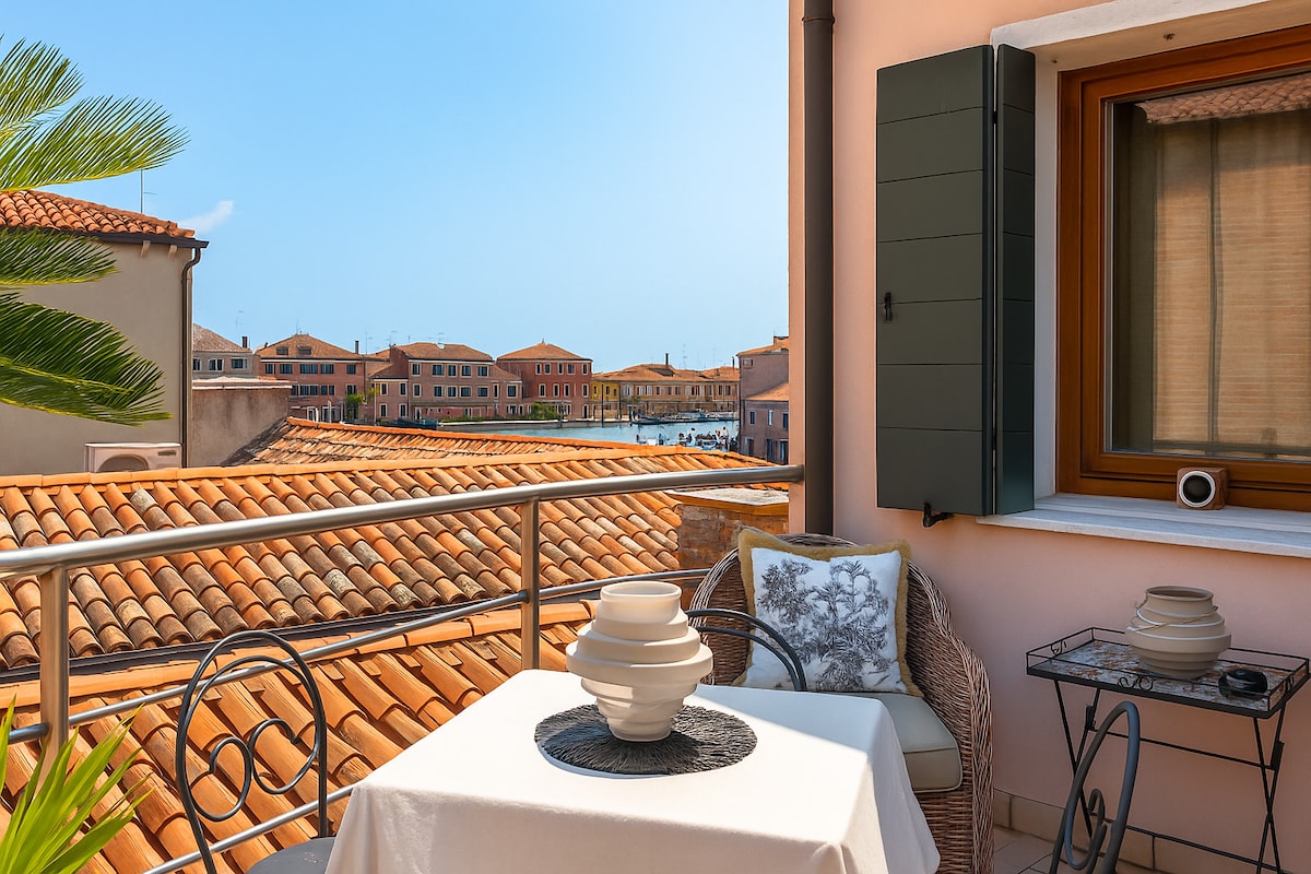 AMETISTA Suite is a 70sqm of show! Located on the second floor and overlooking the Grand Canal of the Murano island, 5 windows and a balcony, a real Suite with unique brightness and incredible view. Restored in 2017 with latest generation lights, independent heating, Wi-Fi and air conditioning, a splendid bathroom of engraved marble decorated by hand with gold and silver leaves, it is a simply idyllic property.