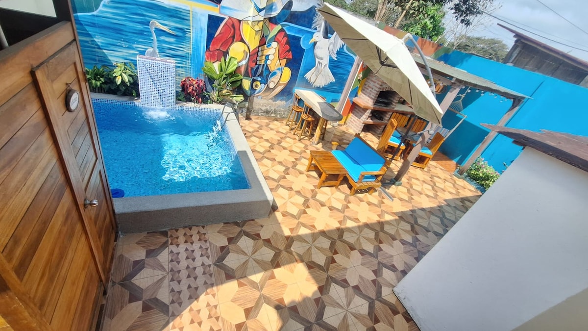 Linda suite muy acogedora de dos pisos (70m2) con A/C Split en el dormitorio y Wifi. Malecón, Playa, Bares y Restaurantes a una cuadra. Si desea parqueadero vigilado 5$ por noche, queda justo al frente de su Airbnb! Cuenta con un dormitorio grande con aire (split) y 2 baños, capacidad 5 a 6 personas. Además, cuenta con cocina equipada, sala, comedor y patio. Calle segunda, pleno centro, al frente del Hotel Marvento ll. Vecindario seguro.