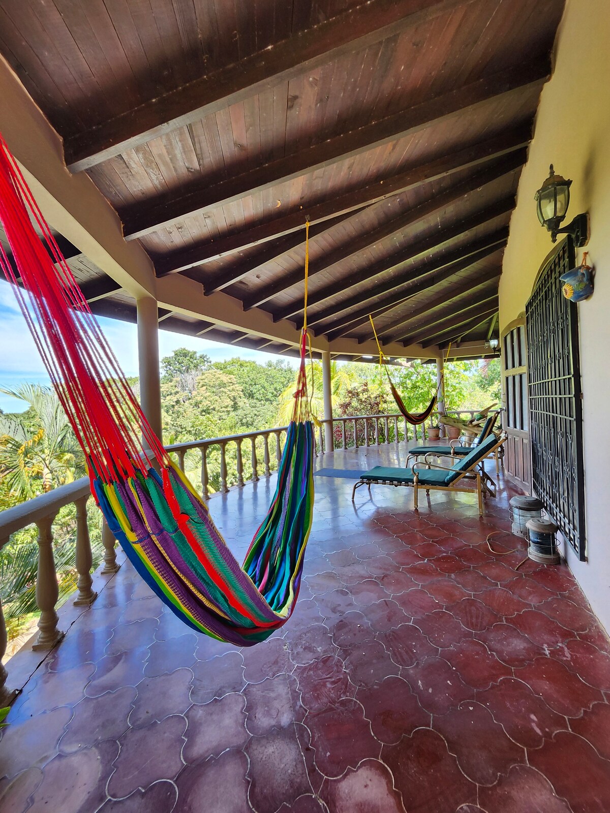 Casa de Alta is a newly painted 2 story house featuring a fully equipped kitchen, complete with a fridge, stove, microwave, and dishwasher. Other amenities are internet, TV, and a barbeque. The outside hosts a large covered deck surrounded by the jungle forest. This house features a spectacular view of the Caribbean Sea and a private pool.