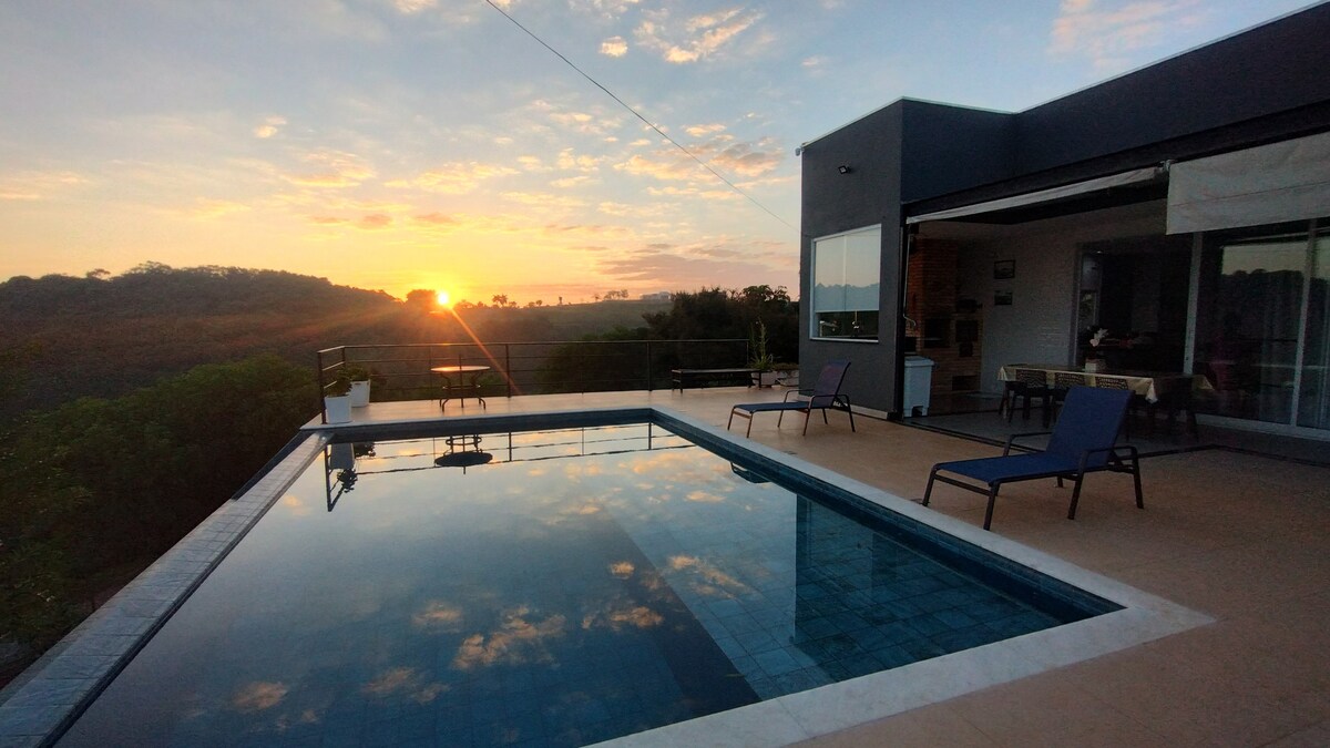 Linda casa, recém construída, com decoração rústica moderna e uma vista incrível para a represa. Aproveite para curtir a natureza e apreciar um belo pôr do sol. A casa, em condomínio fechado, acomoda até 12 pessoas em 3 dormitórios com vista para a represa (ar condicionado) sendo 2 deles, suítes. A cozinha é bem equipada com utensílios e integrada à sala de jantar. Churrasqueira, redário e lareira externa. Piscina borda infinita com opção de *climatização (mediante pagamento de taxa extra).