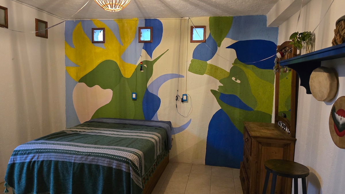 Habitación privada con cama memory foam Queen, baño completo, escritorio, aire acondicionado, cafetera, agua, sensor de calidad de aire y mini refrigerador. Accede a terrazas con jacuzzi, camastros, cocina equipada y vistas increíbles. Contamos con dispositivos que miden la calidad del aire en cada habitación para tu confort y seguridad. Ubicada en el corazón de Xochimilco, a pasos de cafés, restaurantes y arte urbano.