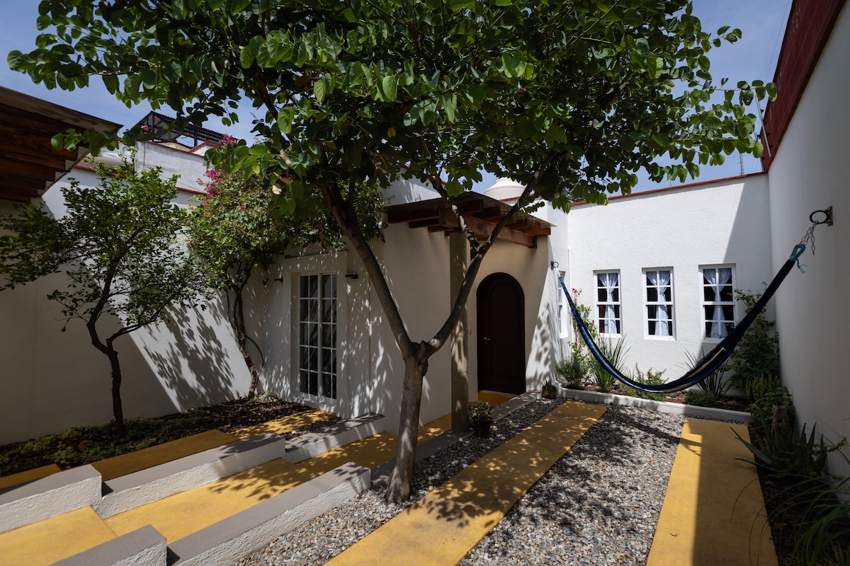 Esta magnífica casa está dividida en dos áreas: la casa principal alberga 3 habitaciones y un segundo edificio tiene 2 habitaciones adicionales. Se puede configurar otro espacio en esta segunda casa para los huéspedes que requieran un dormitorio a nivel de la calle. Con ladrillo visto, suelos de madera y un diseño intrincado, la propiedad de 16145 pies cuadrados se encuentra en uno de los barrios más bonitos y tranquilos de Oaxaca. Un maravilloso jardín te espera al entrar, ¡te encantará tu estancia aquí! Uno de los 5 mejores alojamientos en Oaxaca según la valoración de TimeOut.