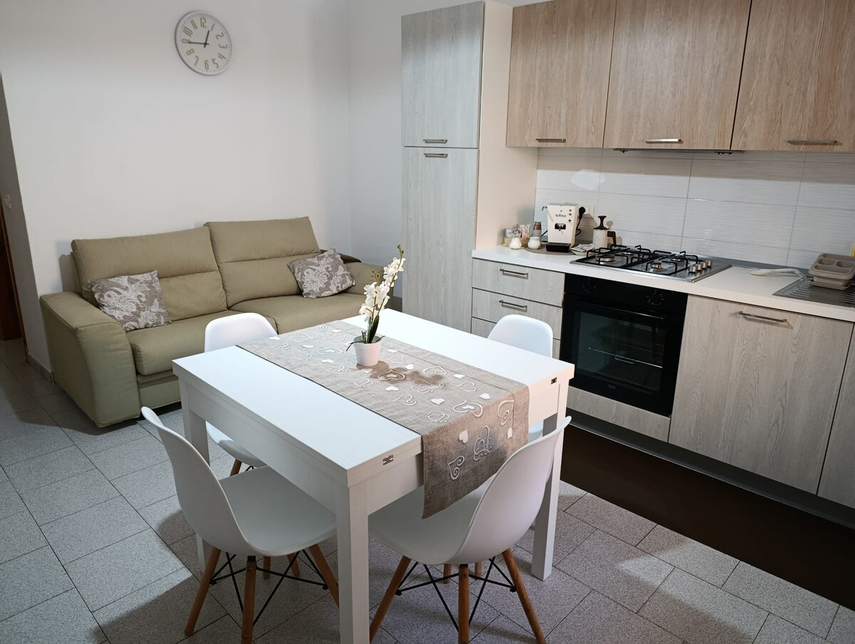 El apartamento, recién reformado, ofrece una estancia tranquila lejos del tráfico y el bullicio diurno y nocturno. Cuenta con una gran terraza con cocina y ducha exterior, zona de relax, sombrilla y tumbonas con vistas al parque del Pollino. En el interior, sala de estar con cocina americana equipada, mesa, TV y sofá cama de 2 plazas. Textil. Baño con ducha y lavadora. Habitación doble. Servicio público disponible. Teléfono de pago LANZADERA PLAYAS-ESTACIÓN Scalea solo meses de verano. TAXI