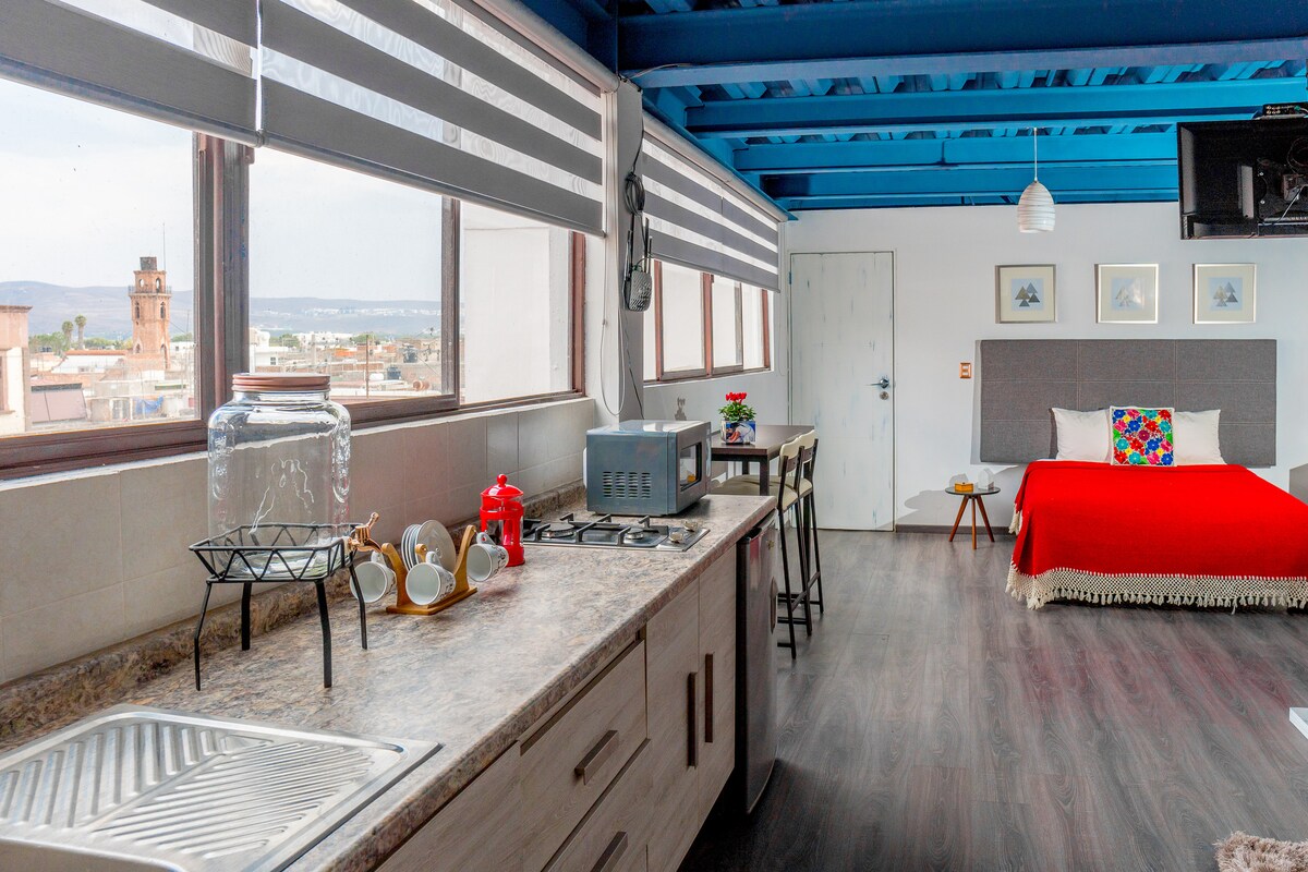Este lugar único tiene un estilo propio. Encantador loft totalmente nuevo, estilo contemporáneo, en el corazón del tradicional Barrio de San Miguelito. Este espacio único y acogedor, está ubicado en la azotea de la casa familiar que data del Siglo XVIII, a unas cuadras caminando del Centro Histórico de la ciudad. Se accede por una Escalera de caracol con 20 peldaños, por lo que tiene mucha privacidad y tranquilidad.